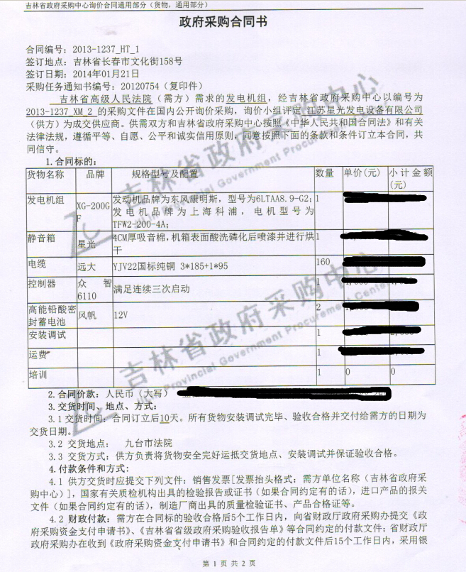 吉林省高級(jí)人民法院政府采購200KW發(fā)電機(jī)組: